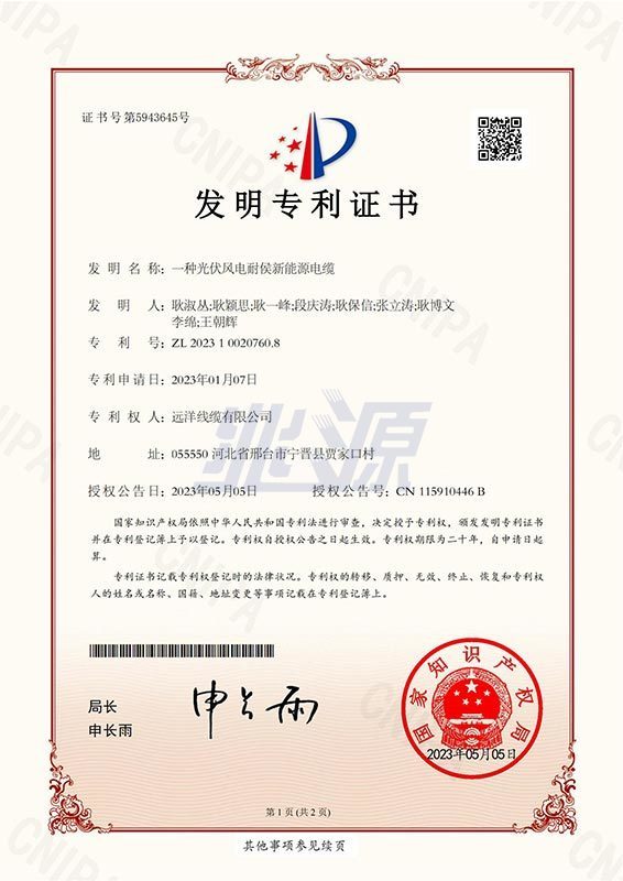 一种光伏风电耐侯新能源电缆.发明专利证书